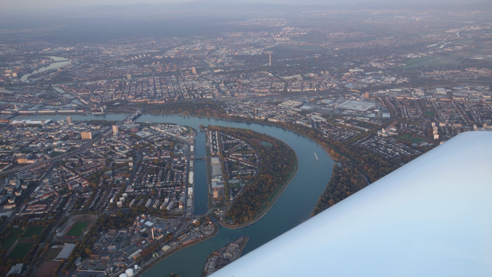 Following the Rhein river via Wiesbaden, then following the Taunus mountain range to the east, deep flight over Frankfurt-City, crossing the Main close by the harbor of Frankfurt, return with heading south to the country side of the Odenwald. After a smooth landing close to the Neckar river in Mosbach-Lohrbach, the second part continued via Sinsheim, Speyer and Mannheim City with industrial compound in Ludwigshafen. After ~100 minutes in total, the journey could been finalized as scheduled by landing on the home base of the airplane at the airfield in Worms (Aero Service Worms).